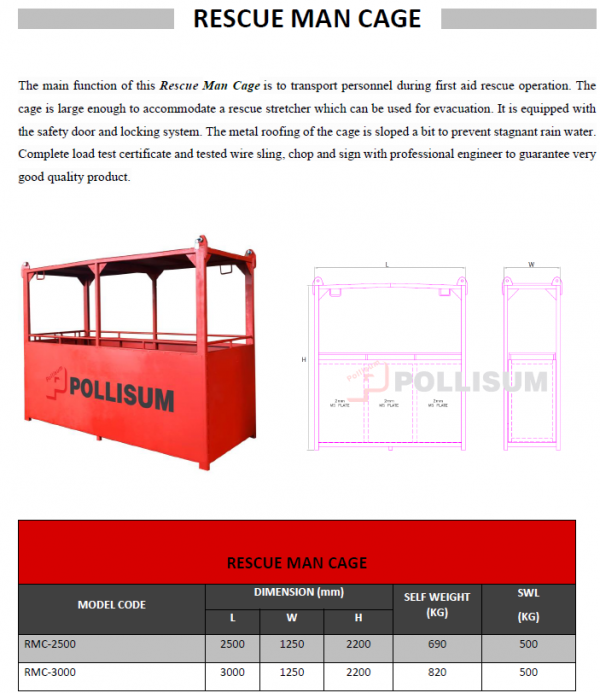 The main function of this Rescue Man Cage is to transport personnel during first aid rescue operation. The cage is large enough to accommodate a rescue stretcher which can be used for evacuation. It is equipped with the safety door and locking system.